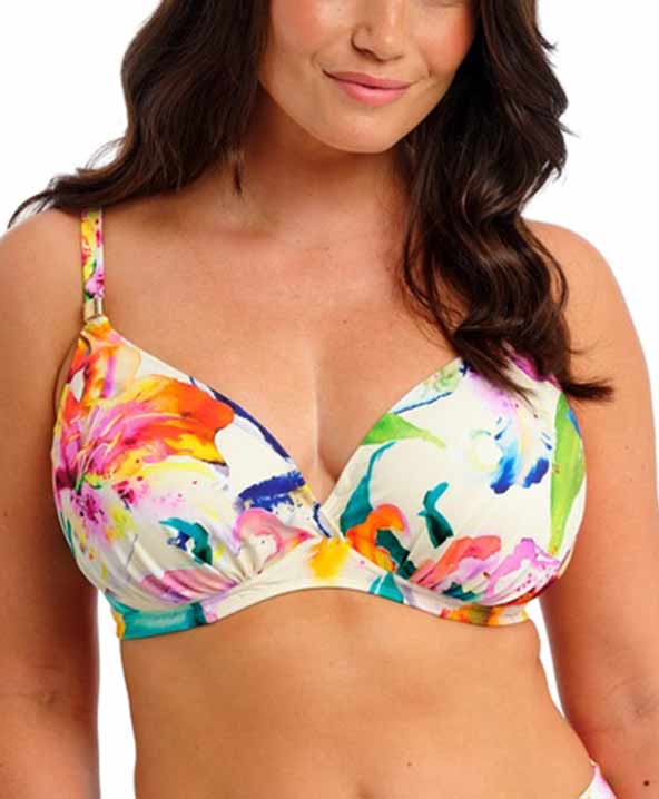 Il top bikini con ferretto in coppe G-H-I è progettato per garantire comfort e sostegno alle taglie Curvy. Il suo nuovo scollo a V multiposizione non solo offre flessibilità nella vestibilità, ma anche un’interpretazione moderna delle forme classiche.