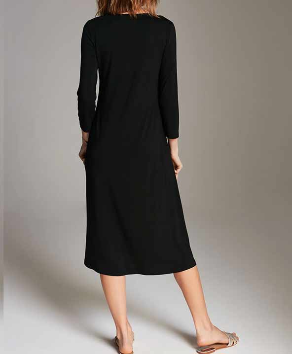 La piega a cannoncino sul davanti centrale, insieme alla silhouette a trapezio, è concepita per esaltare le curve del corpo, facendo sentire chi la indossa a proprio agio e al tempo stesso affascinante. Le maniche a 3/4, leggere e ariose, garantiscono una vestibilità ottimale, mentre la lunghezza al ginocchio contribuisce a conferire all’abito un’ulteriore dimensione di eleganza e praticità.