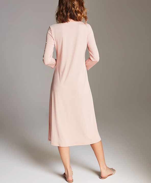 La piega a cannoncino sul davanti centrale, insieme alla silhouette a trapezio, è concepita per esaltare le curve del corpo, facendo sentire chi la indossa a proprio agio e al tempo stesso affascinante. Le maniche a 3/4, leggere e ariose, garantiscono una vestibilità ottimale, mentre la lunghezza al ginocchio contribuisce a conferire all’abito un’ulteriore dimensione di eleganza e praticità.