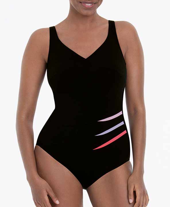 Il costume da bagno intero dotato di taschine interne per l’inserimento di coppette o protesi rappresenta una soluzione ideale per le donne che cercano un perfetto equilibrio tra stile e funzionalità. Il colore nero, scelto per la sua versatilità e raffinatezza, è arricchito da inserti colorati che offrono un effetto snellente, sia visivo che pratico.