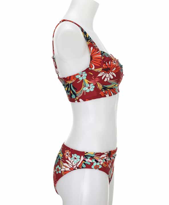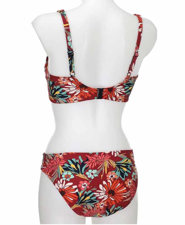 Gli slip hanno altezza media. La fantasia di colori floreali è molto vivace, e adatta sia alla pelle abbronzata che alle carnagioni più chiare. Le spalline sono regolabili per sostenere le coppe.
