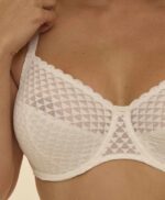 Questo reggiseno con ferretto copre la fascia di taglie con le coppe più profonde. Realizzato senza imbottitura, questo modello si distingue per il suo design femminile, che unisce un mesh effetto guaina e un raffinato pizzo francese venato. La silhouette scolpita e le curve ridisegnate offrono una vestibilità impeccabile, capace di adattarsi alle forme del corpo in modo armonioso.