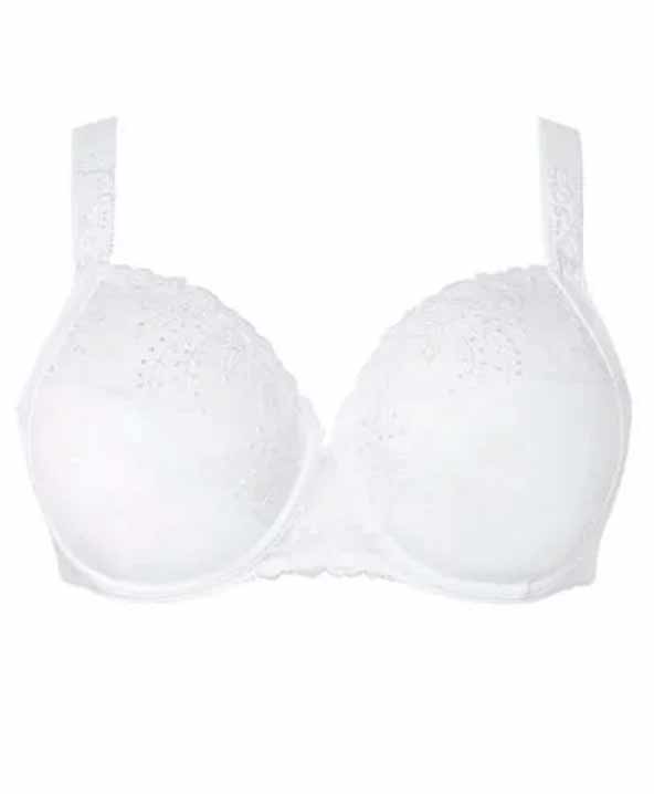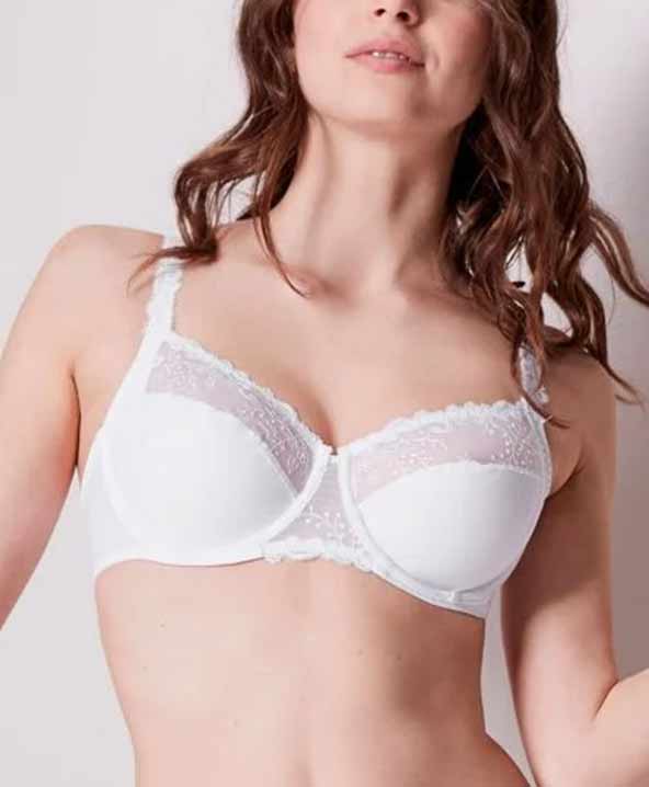 Reggiseno a coppa piena in tessuto lavorato e decorato con ricami, dotato di ferretto. Offre una forma a coppa piena sulla banda sotto-seno per un sostegno superiore e maggior comfort. Le coppe sono strutturate in tre parti per garantire una forma arrotondata. La parte superiore delle coppe presenta un ricamo con bordo ondulato. La parte inferiore è foderata in cotone per un comfort elevato e include un rinforzo laterale in tessuto lavorato opaco per un sostegno aggiuntivo. Il centro anteriore è ornato da ricami con bordo ondulato ed è foderato con tulle resistente. Il retro incrociato è realizzato in tessuto lavorato elastico per garantire un supporto ottimale. Le spalline sono regolabili e impreziosite da dettagli in guipure.