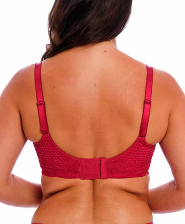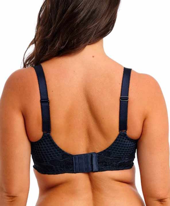 La parte superiore della coppa è in pizzo, con un effetto visivo di alleggerimento. Le fasce posteriori in powernet forniscono ulteriore ancoraggio e sostegno. Il pizzo si ritrova anche nella fascia sottoseno e nel separatore, con un tocco decorativo lucente.