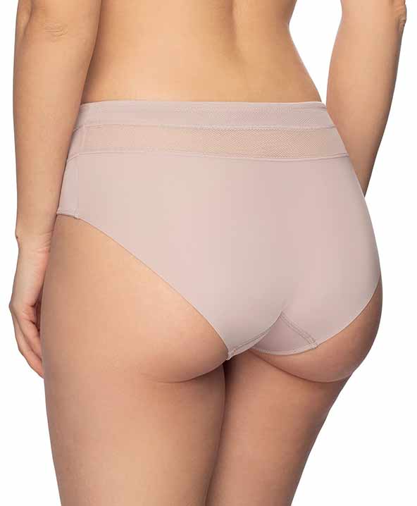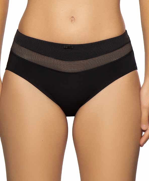 Lo slip a vita medio-alta è uno slip classico ingraziosito da un banda trsparente molto delicata e discreta. Grazie al taglio a laser nella parte posteriore risulta perfetto sotto gli abiti aderenti. Nella parte superiore lungo tutta la circonferenza ci sono due fasce di retina semitrasparente. Questo slip è una sintesi di comodità e praticità nella vita quotidiana.