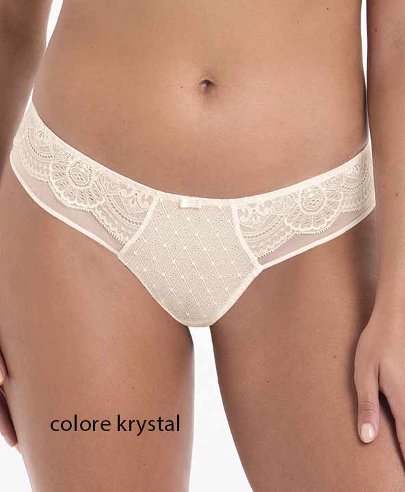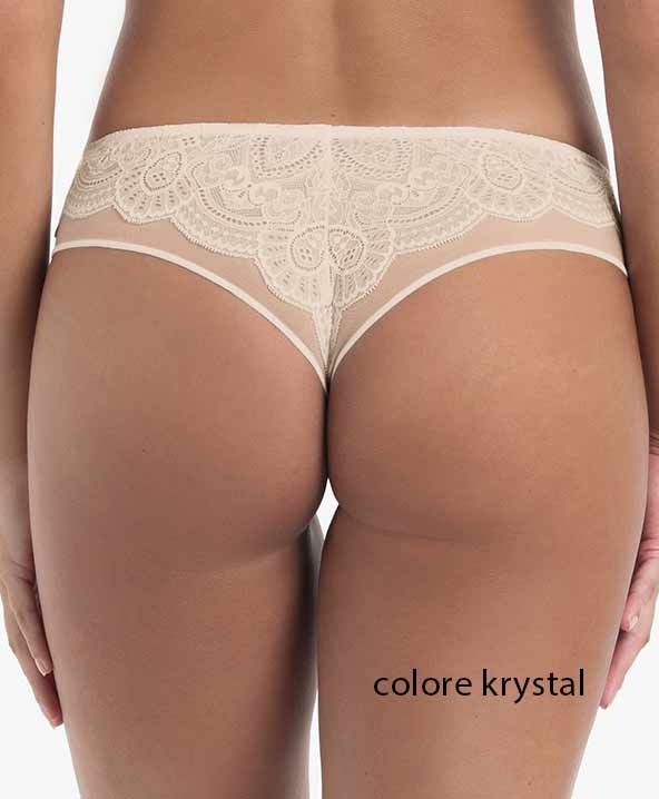 Slip abbinato ai reggiseni della linea Selma in pizzo All-over. Il pizzo filigranato su tulle trasparente accentua il look fresco e sbarazzino degli shorty della serie Selma, oltre a ridurre otticamente le forme, la parte posteriore della brasiliana è in pizzo All-over